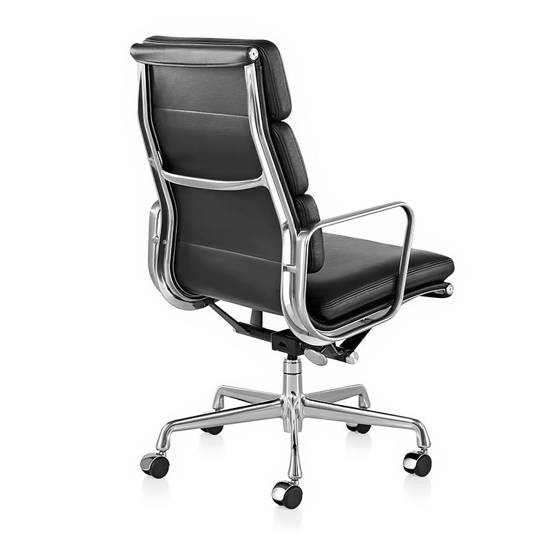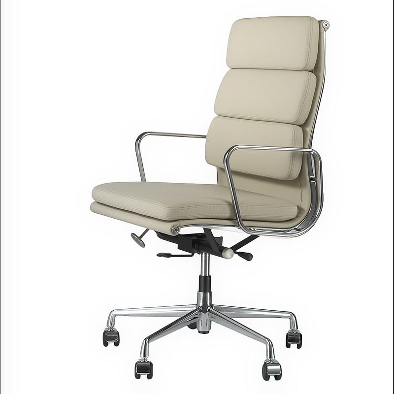 SOFT | Al diseño clásico se le agregan almohadones extendiendo el grupo de sillas. Esta nueva versión fue llamada “Soft” y se fabrica en forma paralela al grupo original. Sillas de respaldo alto, con o sin apoyabrazos. Estructura y bases de 5 radios en Aluminio fundido y pulido, con giro y ruedas. Sistema basculante y regulación de altura neumática opcional. Tapizados en tela, ecocuero, o cuero.