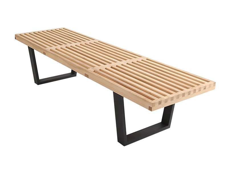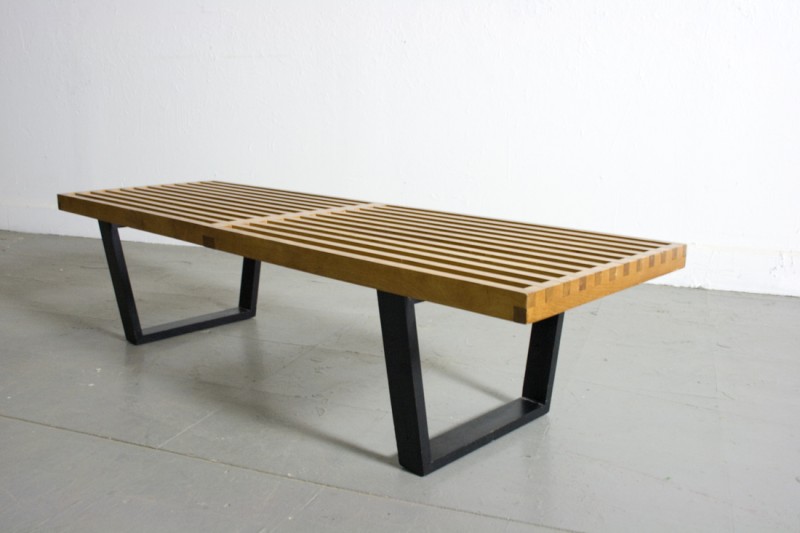 Diseñado en 1946. La expresión de la forma claramente rectilínea de este banco refleja el trasfondo arquitectónico de George Nelson. Como muchos clásicos del diseño, se puede emplear de manera flexible y variable como banco o mesa para colocar objetos. Terminaciones: roble macizo y bases metálicas con pintura texturada.