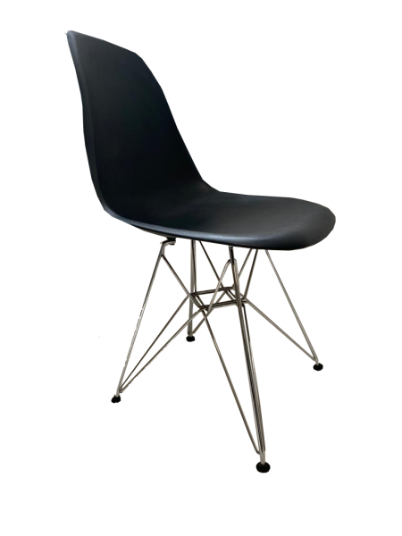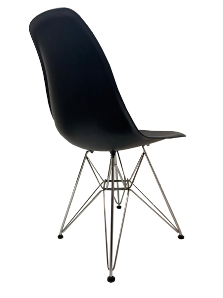 La base «Eiffel Tower» de la silla DSR (Dining Height Side Chair Rod Base), se caracteriza por una intrincada y elegante construcción de cable de acero, combina ligereza y elegancia de formas con resistencia estructural.