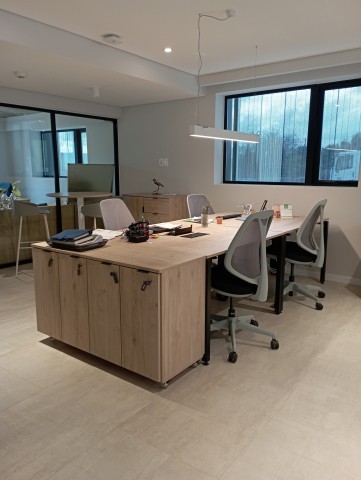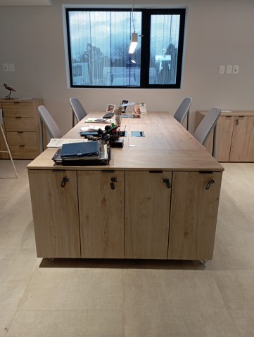 Continuaron con nuestros escritorios individuales y gerenciales de la línea FRAME ARCO acompañados con muebles de guardado que incluyen ruedas para una movilidad sin esfuerzo.